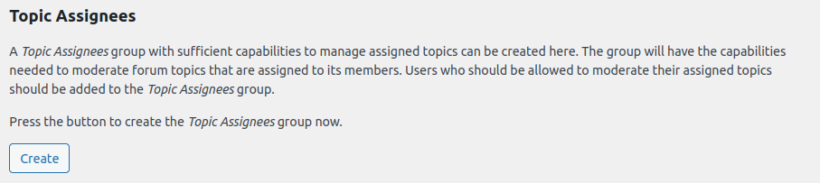 Upon clicking the Create button, the Topic Assignees group is created and an appropriate set of capabilities is automatically assigned to it.