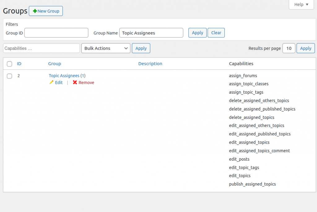 Tip: Review your Topic Assignees group and its assigned capabilities through your Dashboard via Groups > Groups.