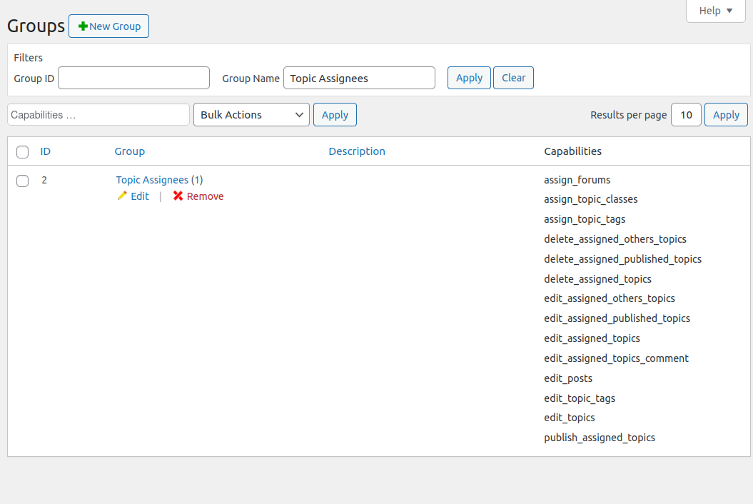 Tip: Review your Topic Assignees group and its assigned capabilities through your Dashboard via Groups > Groups.