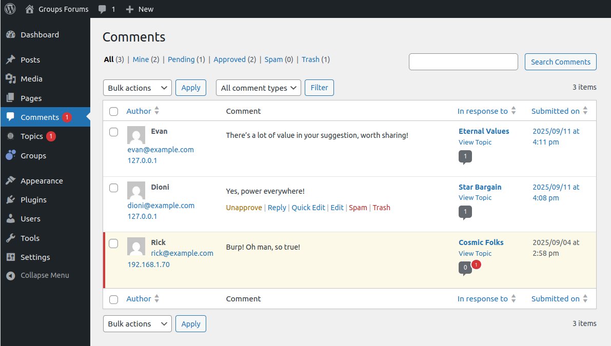 Topic Comments can be viewed, managed, approved, or unapproved in the WordPress Comments section.