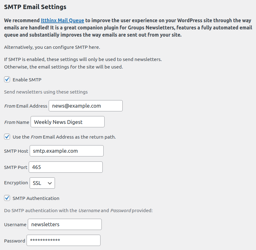 When SMTP is enabled and configured, newsletters are sent out using these settings. This does not affect other emails sent out through the site. You can use the Send test email box to test your configuration by sending a test email to a chosen email address.